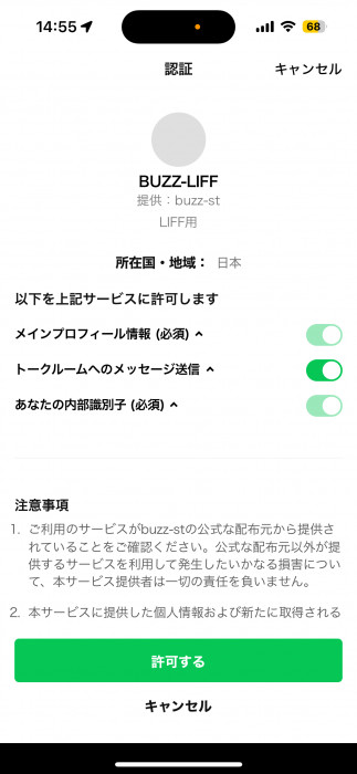 中央の項目がすべて緑色(ON)になっていることを確認し、**「許可する」**を押してください。