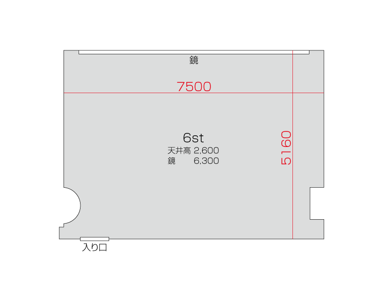 広さ 38.3㎡ 天井高 2.6m 鏡 6.3m