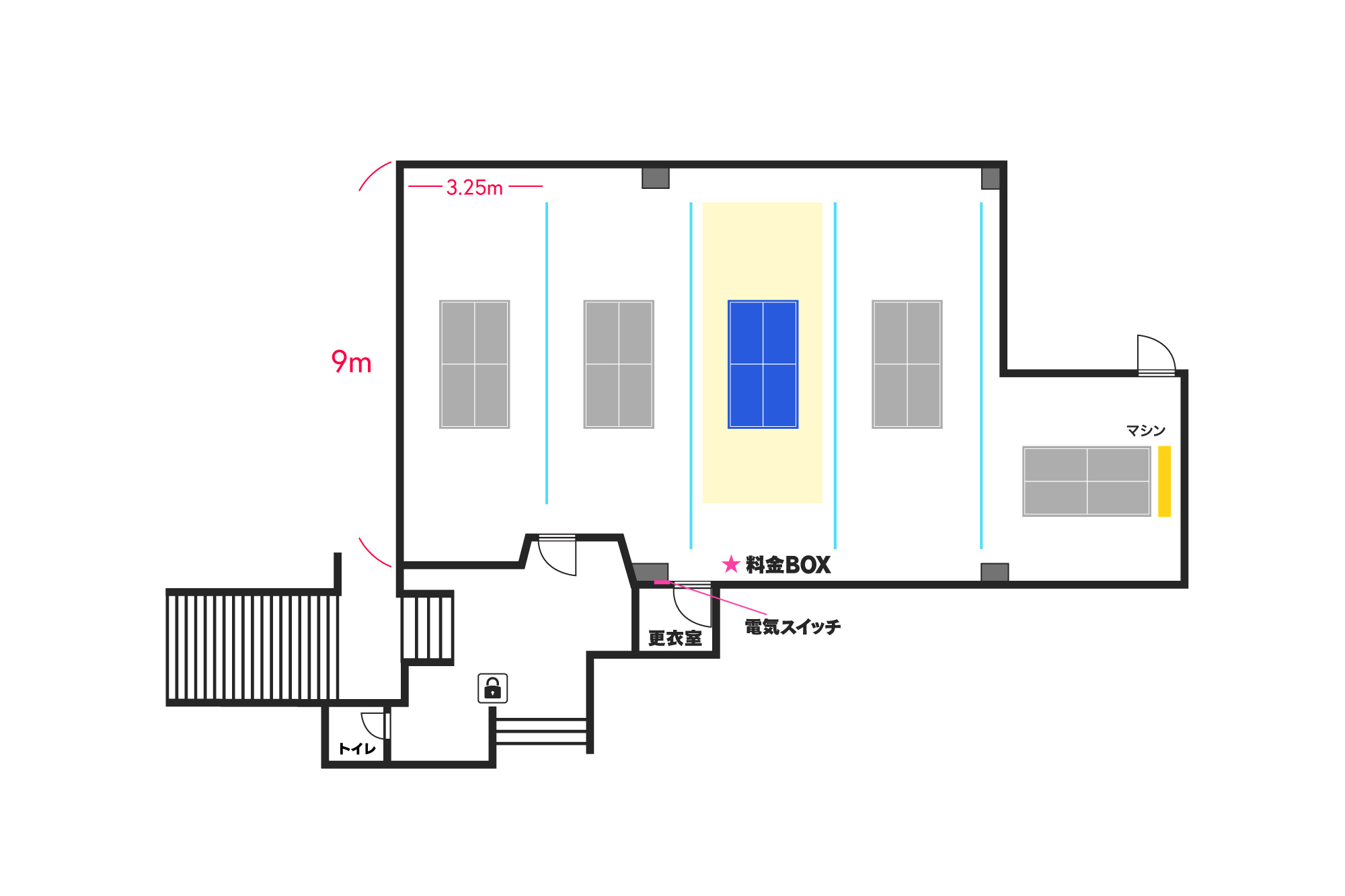 スタジオの入口前で靴を脱いでいただき、電気を点けてお使いください。受付での手続きなどは一切ございません。