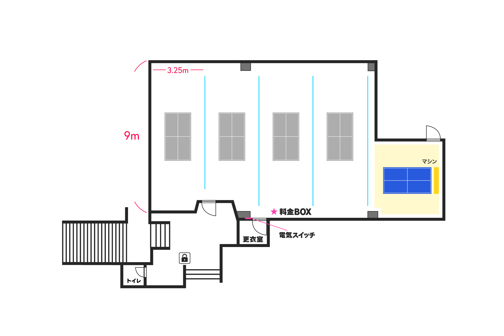 スタジオの入口前で靴を脱いでいただき、電気を点けてお使いください。受付での手続きなどは一切ございません。