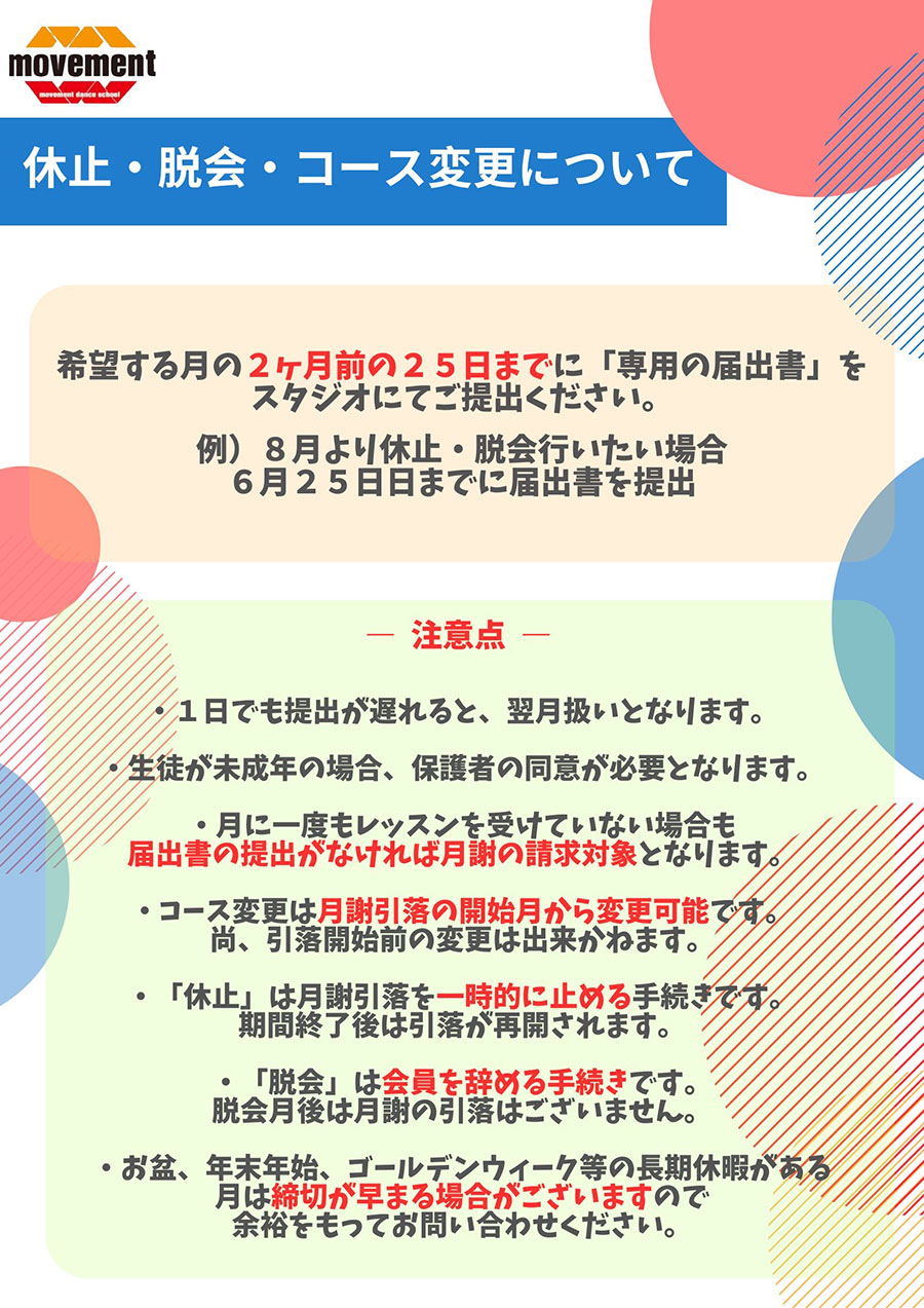 ※基本的には月4週のレッスンですが、少ない日程の振替のレッスンはありません。